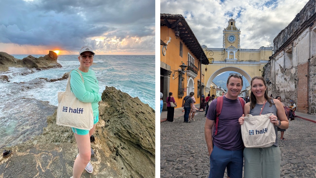 Amanda Jonas (left) brought her Halff bag along while celebrating her 20th anniversary in Isla Mujeres, Mexico, stopping at Punta Sur’s Cliff of the Dawn and visiting the statue of Ixchel.