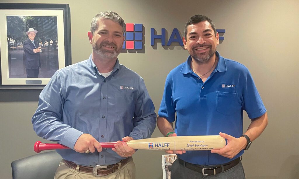 President/CEO Mark Edwards awarded the Home Run Award to Houston Production Manager Erik Verduzco. The Home Run Award is presented to an employee who embodies the spirit of Halff through leadership, ownership, excellence and the growth of others.